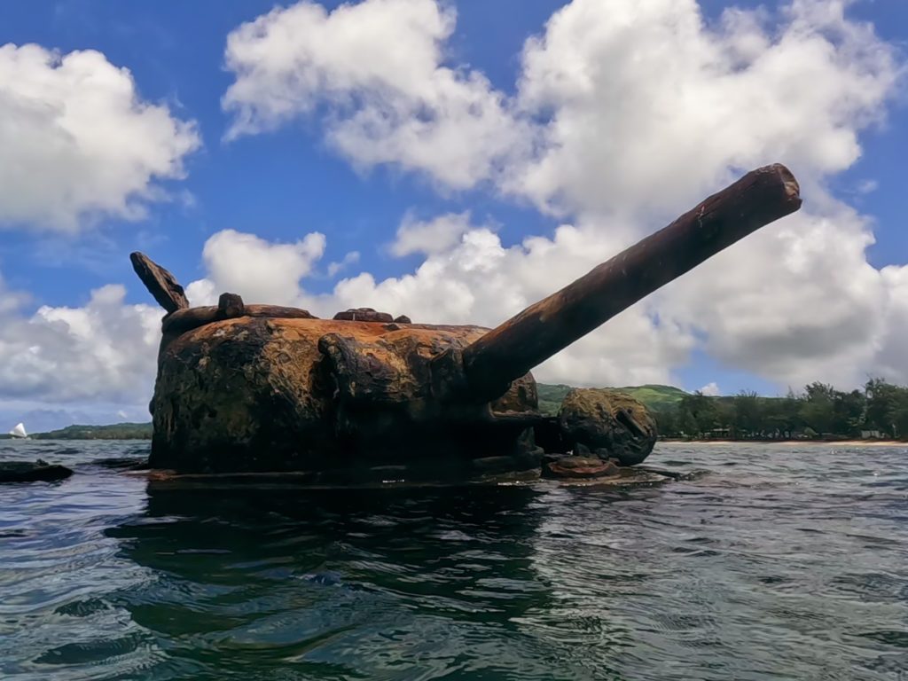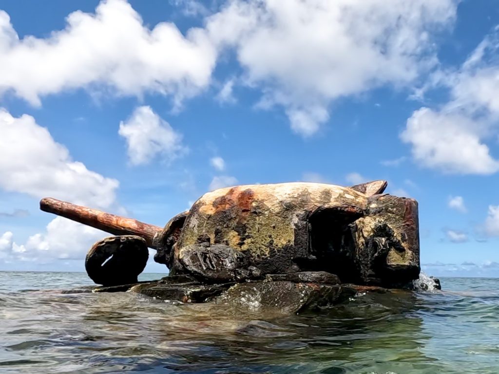 この戦車は上陸作戦中に何らかの原因で動かなくなり頓挫、陸にたどり着くことなく80年以上経った今もこの場所にその姿をとどめています。